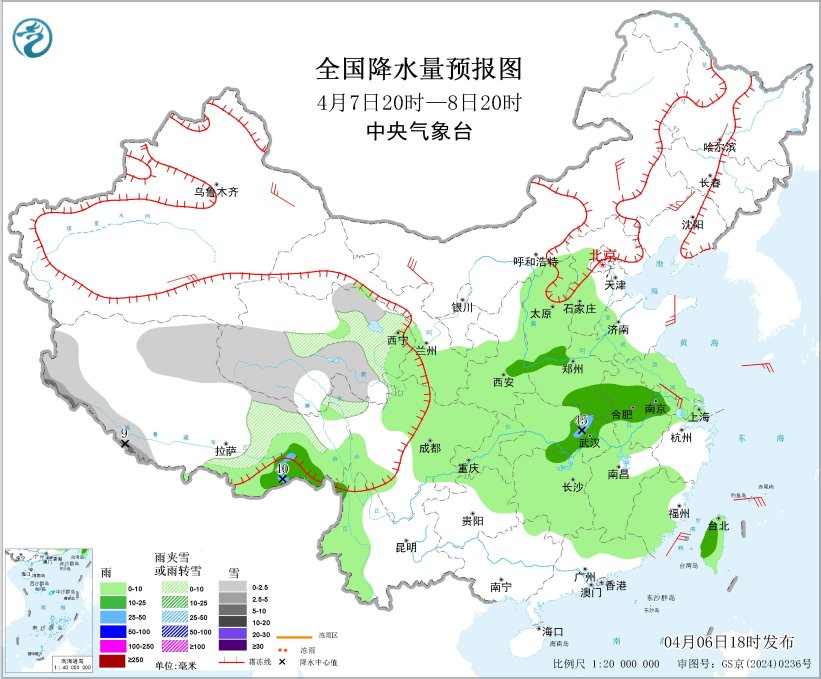 4月7日20时至8日20时,青海南部、西藏西南部和东北部等地有小雪或雨夹雪,其中,西藏西南部部分地区有中到大雪。湖北中部、河南南部和西北部、山西南部、陕西东部、安徽中部、江苏西南部、西藏东南部、台湾岛西部等地部分地区有中到大雨。内蒙古、东北地区大部、山东半岛、安徽、江苏、甘肃中部、新疆东部等地部分地区有4~6级风;台湾海峡将有6~7级风、阵风8级(见图3)。