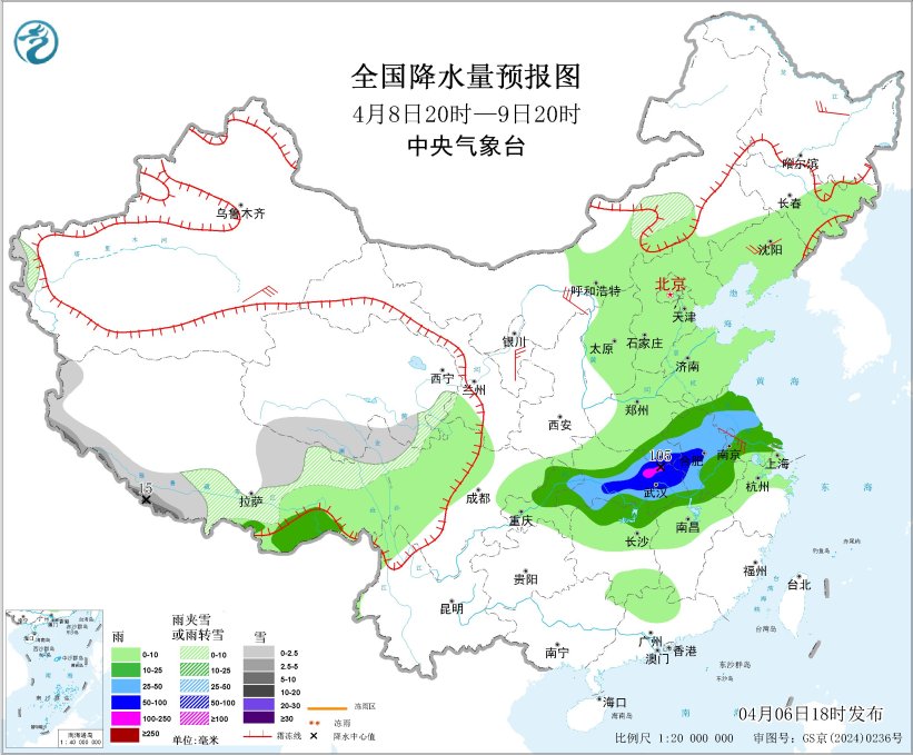 4月8日20时至9日20时,西藏东北部和西南部、青海南部等地有小雪或雨夹雪,其中,西藏西南部部分地区有中到大雪,局地暴雪(10~15毫米)。重庆北部、湖南北部、江西北部、湖北大部、河南南部、安徽、江苏、西藏东南部等地部分地区有中到大雨,其中,湖北东北部、安徽西部、河南南部局地有暴雨到大暴雨(50~105毫米)。内蒙古西部、宁夏、黑龙江东部、辽宁、山东半岛、安徽中东部、江苏中南部等地部分地区有4~6级风;东海、黄海南部海域将有6~7级风、阵风8级(见图4)。