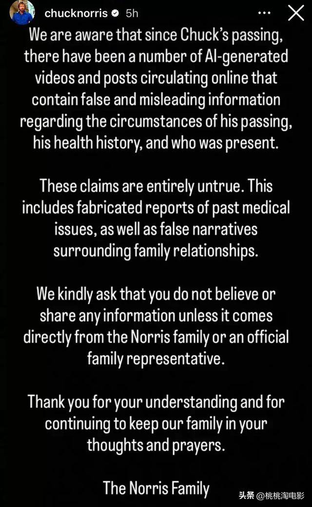 86岁的动作巨星查克·诺里斯于上月在夏威夷突发疾病离世。就在家人深陷悲痛之际,网络上竟疯传起由人工智能伪造的葬礼视频与虚假病史,甚至牵扯出他的过往情史与家庭纠纷。面对越演越烈的网络谣言,诺里斯家族终于打破沉默,正式发声维权。