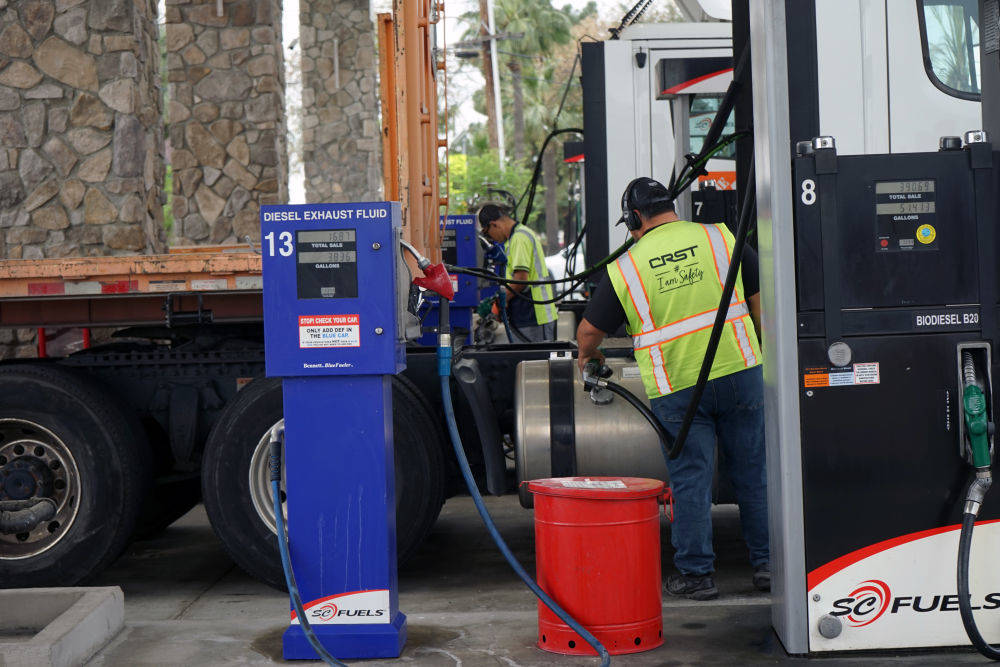 3月31日,在美国加利福尼亚州蒙罗维亚市的一座加油站,司机为卡车加油。新华社发(曾慧摄)