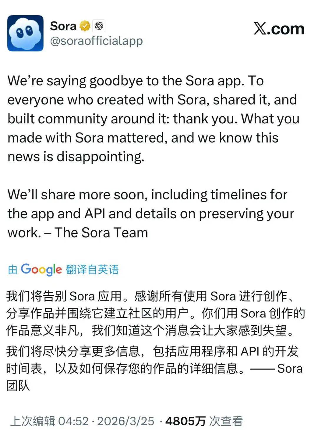 3 月 24 日,OpenAI 在社交媒体上宣布关停旗下人工智能视频生成工具 Sora。这款曾在 2024 年惊艳世界、被视为电影工业颠覆者的明星产品,在历经两年的高光与挣扎后,正式退出了历史舞台。OpenAI 与迪士尼价值 10 亿美元的 IP 授权合作也随之落空。