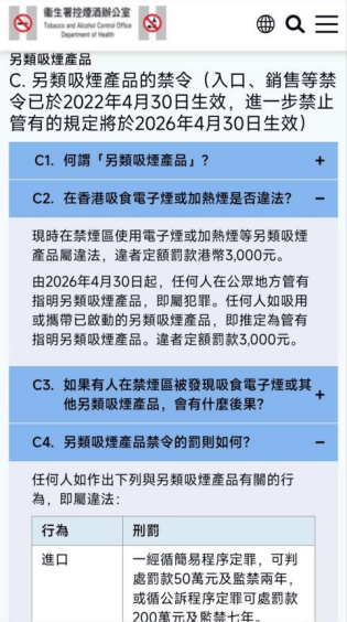 根据香港特区政府《2025年控烟法例(修订)条例草案》,为加强保障公共卫生,减少吸烟对个人健康和社会医疗系统的负担,相关对电子烟的管控条例将于4.30开始实行。
