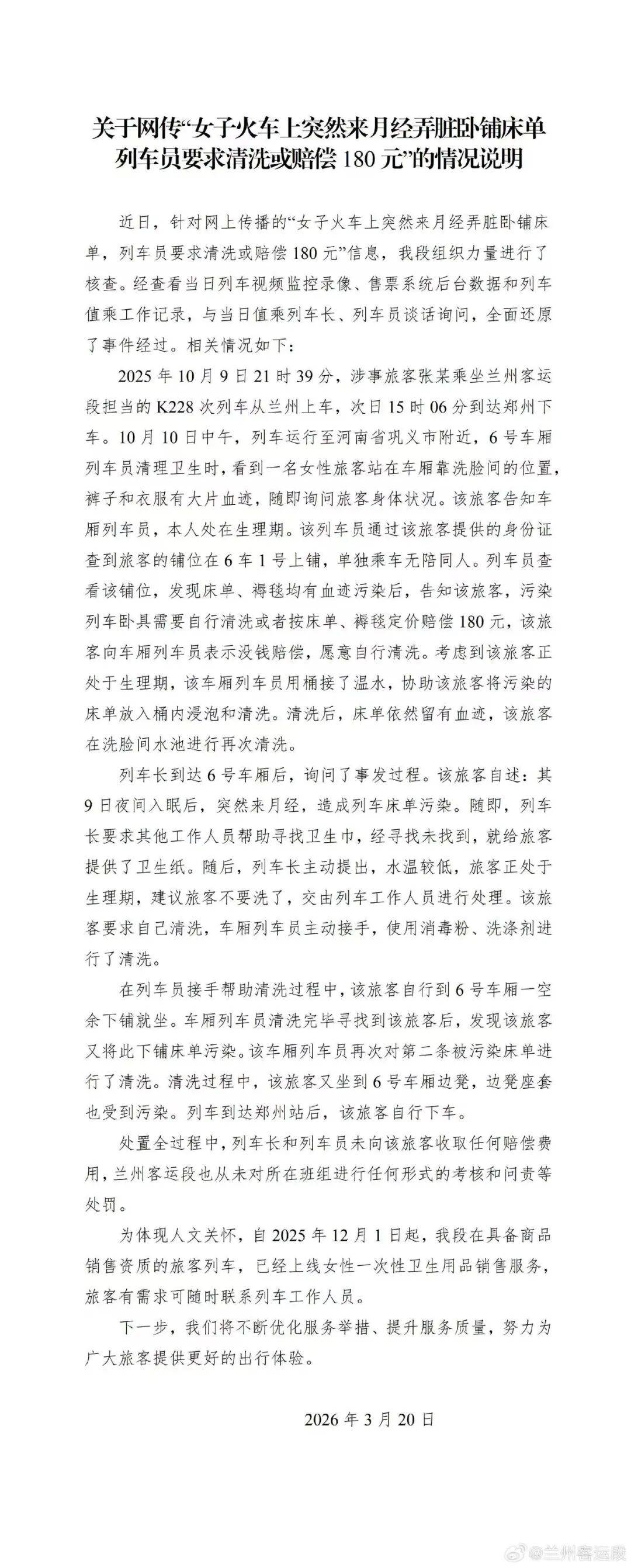 3 月 20 日,一份关于床单的官方通报由兰州铁路局发布。之后,当事人张女士通过微博公开了现场录音、Live 图及照片进行逐条反驳。