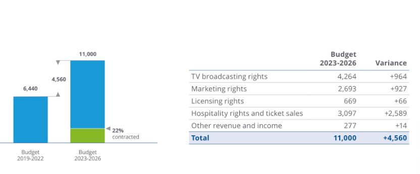 授权经济成体育产业核心增长极根据FIFA在年度报告中披露的2023年—2026年周期预算,相关授权商品的商业等收入约110亿美元,其中转播权收入约42.64亿美元,门票及款待收入约30.97亿美元,商业赞助收入约26.93亿美元,授权(licensing)收入约6.69亿美元。尽管授权收入体量相对有限,仅占约6%,但显然会被进一步强化。