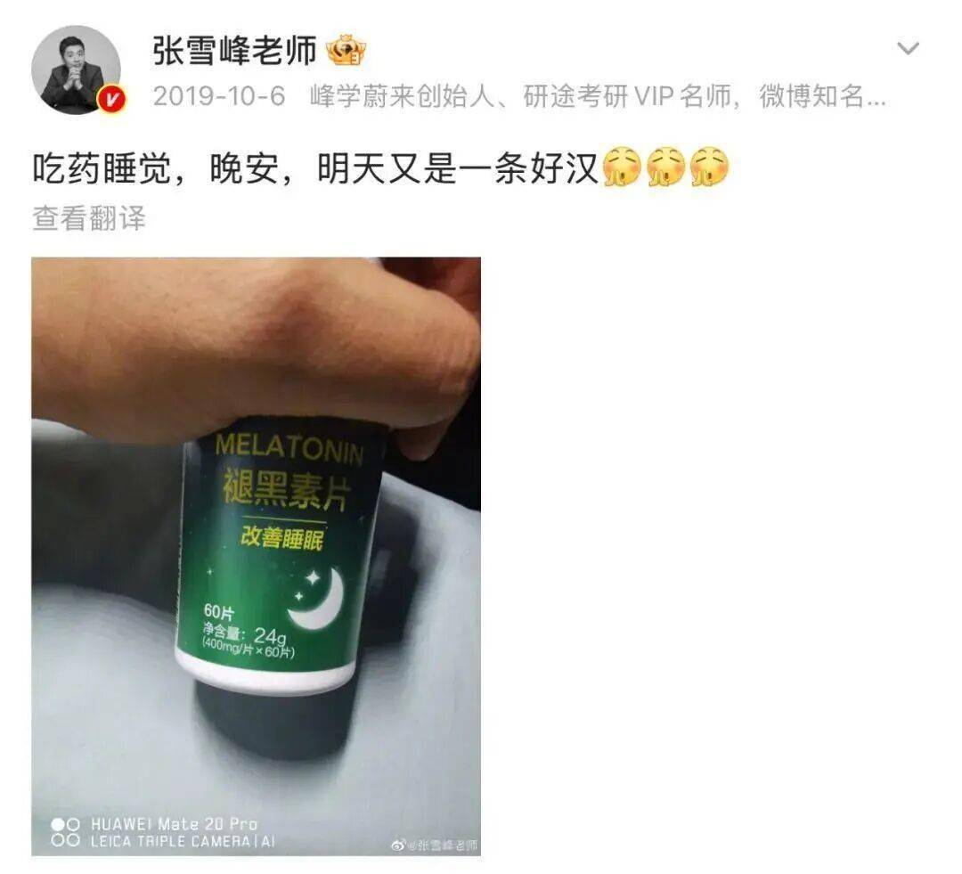从微博信息可以得知,张雪峰至少从2019年10月起就开始服用褪黑素,“吃药,睡觉,明天又是一条好汉”。