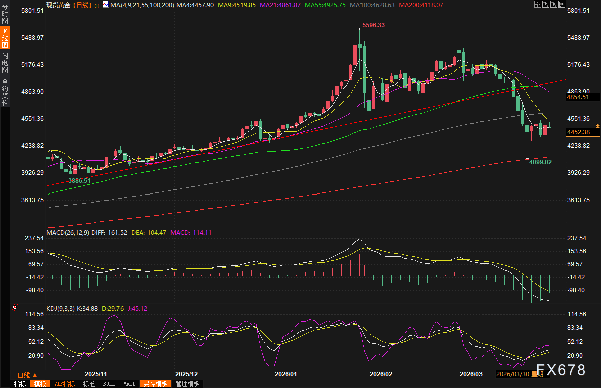 在这种环境下,黄金作为传统避险资产,本应迎来强势支撑。然而,实际情况却呈现复杂拉锯:低吸买盘一度推动金价急升近3%,黄金在3月28日前后从四个月低点附近反弹,最高触及4554美元/盎司附近,上周五收涨约2.6%至4495美元左右。但周一(3月30日)早盘又冲高回落至4450美元附近,跌幅约1%。美元走强、通胀预期升温打压降息前景,对金价形成明显压制;同时,战争不确定性带来的避险情绪又提供支撑,导致金价走势震荡。