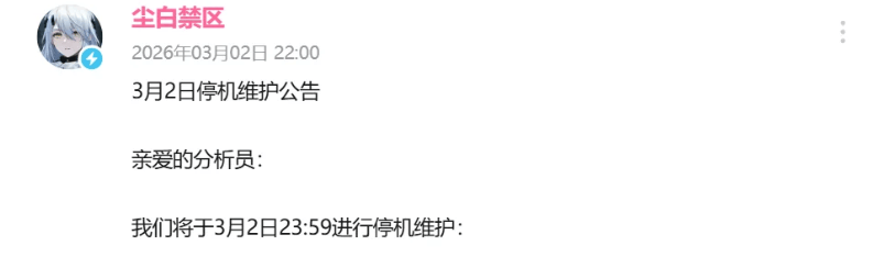 3月2日晚22点,《尘白禁区》官方突然发布紧急停服维护公告,宣布游戏服务器即刻关闭。与以往例行更新不同,此次公告未明确开服时间,仅以“数据量较大,维护周期可能相对较长”一笔带过。
