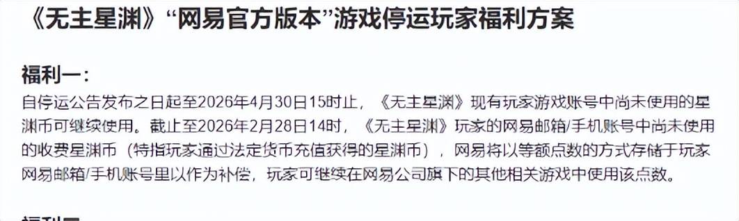 《无主星渊》国服官方宣布,因开发与运营策略调整,《无主星渊》国服将于2026年4月30日15时正式终止运营,关闭游戏服务器与官方网站。