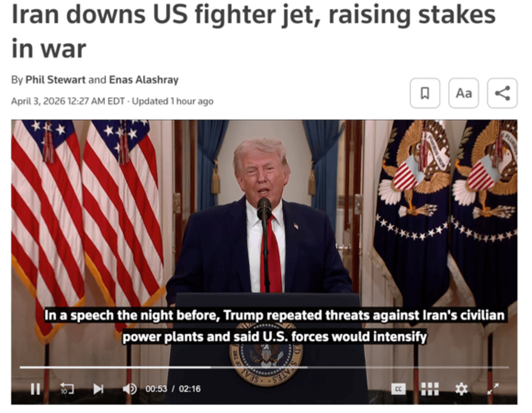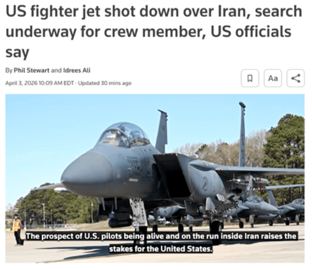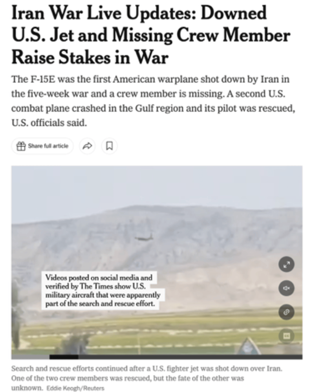 △《纽约时报》报道,美军战机在伊朗被击落,这是五周战争中首架被击落的美军战机。