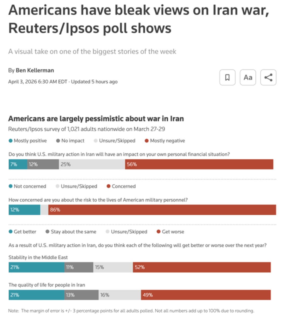 △路透社4月3日发布最新民调,美国民众普遍对伊朗战争持悲观态度。
