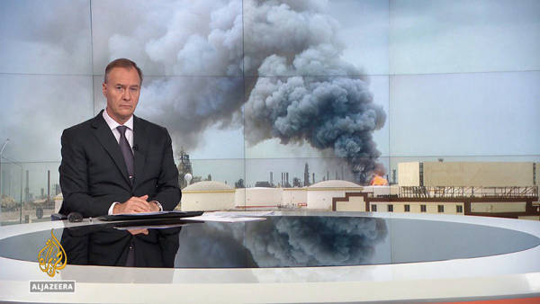 卡塔尔半岛电视台播报中东两家铝厂遭袭击的画面视频截图
